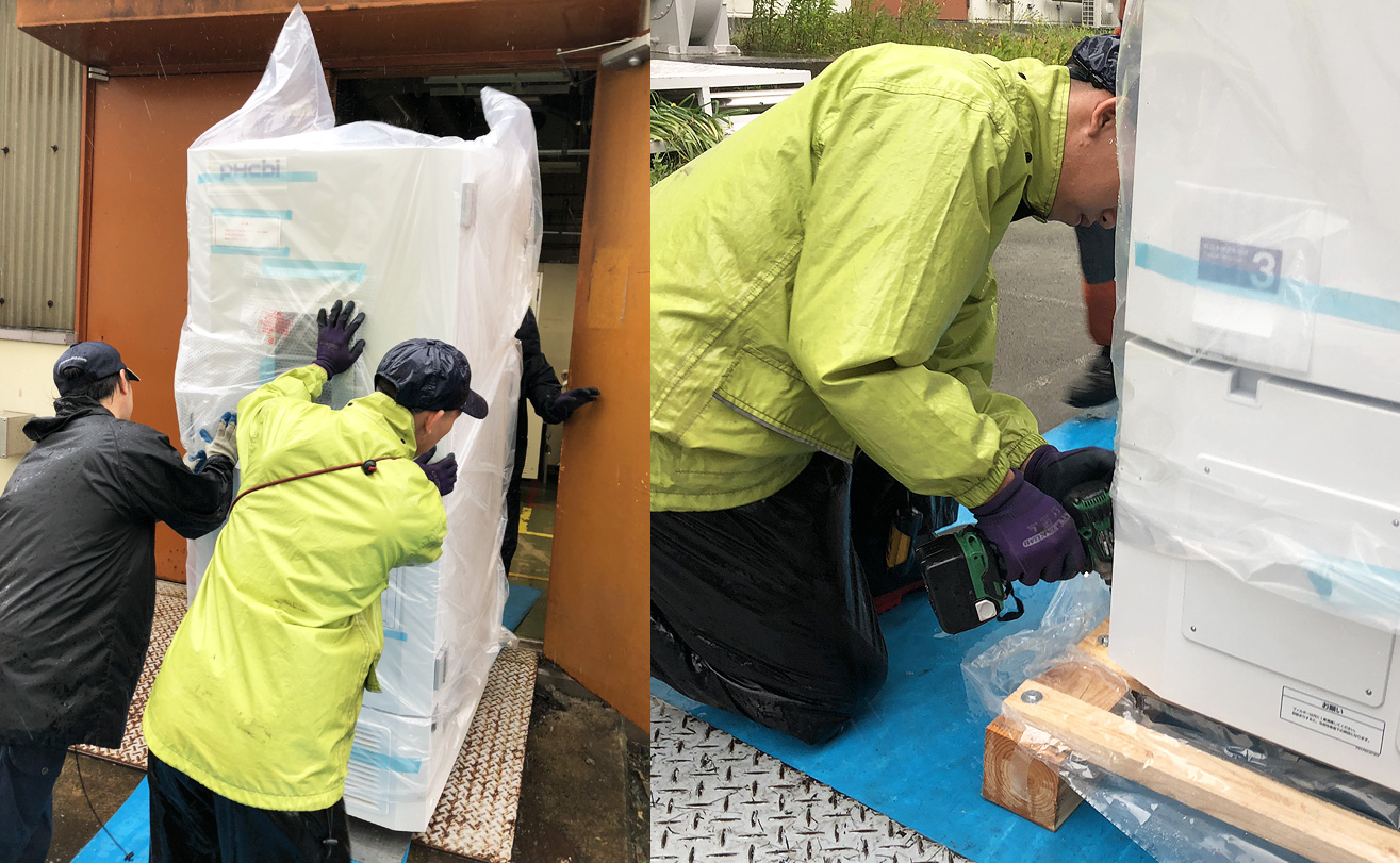 Detailed goals toward mass production are reached by checking applicable laws and regulations for each country and assessing prevailing environmental measures and confirming costs. Hand-made engineering samples (ESs) undergo various performance/quality verification steps such as thermal conduction analysis, acceleration testing, durability and vibration testing, providing the team with points to be improved upon for mass production. The compressors on the refrigerated engineering samples are removed after running in extreme environments for an extended period of time so that wear patterns of the main components can be verified in detail.