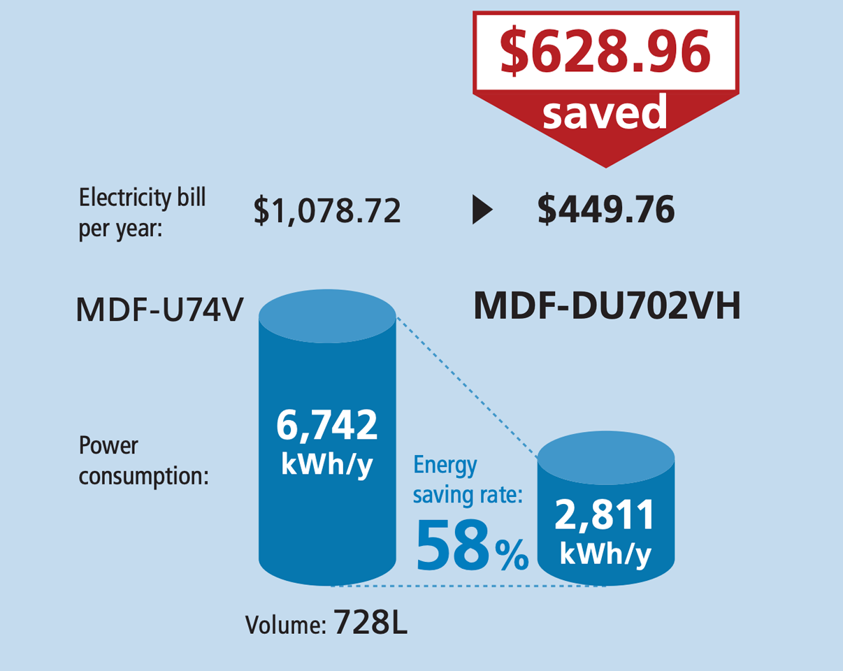 PHCbi’s ULT freezer is equipped with HC refrigerants which do not affect the ozone layer, and an inverter controlled compressor which reduce the ON/OFF operation that increase electricity bills. As a result, our ULT freezers use approx. 58% less energy compared to models launched 10 years ago, which can add up to a reduction of $628 from your annual electricity bill per unit.