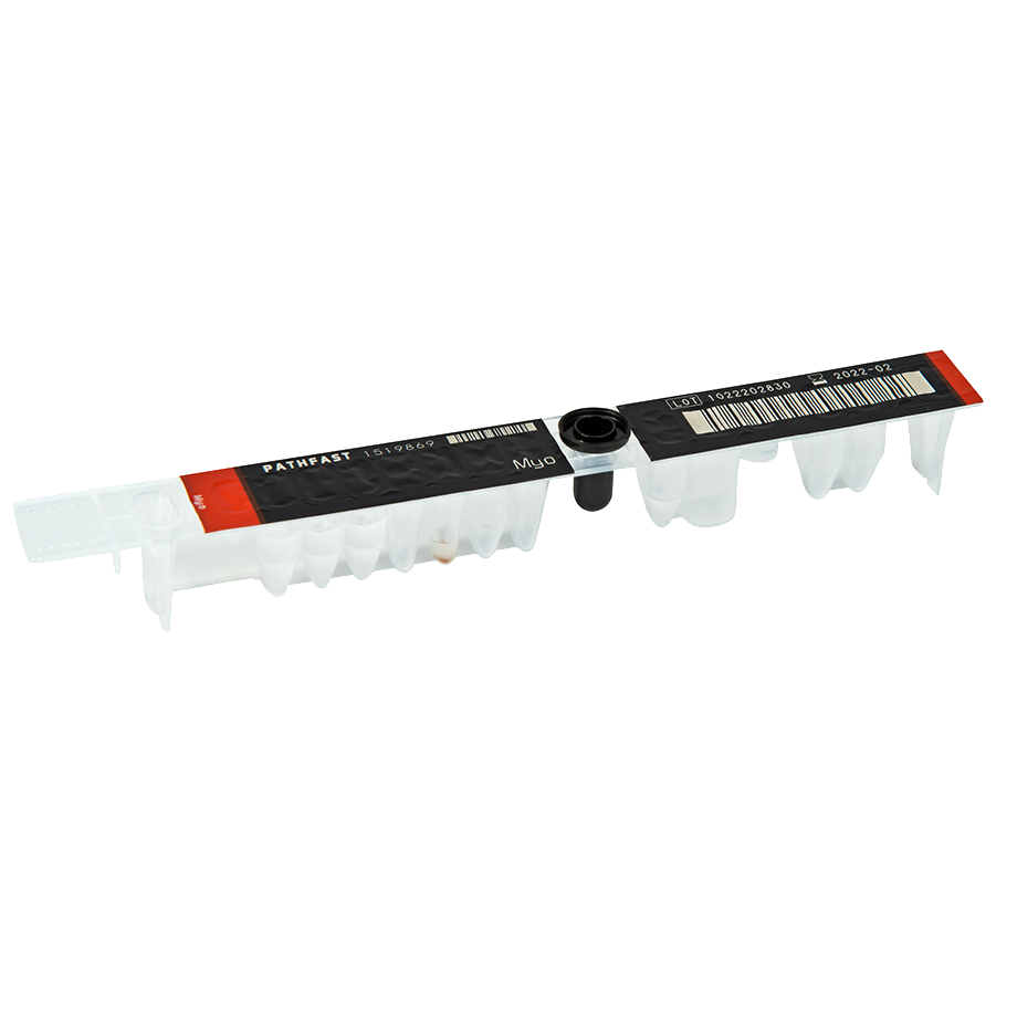 PATHFAST™ Myo ist ein Produkt zur In-vitro-Diagnose, das zusammen mit dem In-vitro-Diagnosesystem PATHFAST™ zur quantitativen Messung von Myoglobin in heparinisiertem Vollblut und Plasma eingesetzt werden kann. Das mittels des Assays angezeigte Ergebnis dient der Unterstützung der Diagnose, insbesondere zum Ausschluss eines akuten Herzmuskelinfarkts. Myoglobin (Myo) ist ein Hämprotein mit niedrigem Molekulargewicht, das sowohl im Herzmuskel als auch im Skelettmuskel zu finden ist. Myoglobin ist nach dem Auftreten einer Myokardnekrose in Verbindung mit einem akuten Herzmuskelinfarkt einer der ersten Marker, der über die Normalwerte ansteigt und 1 bis 3 Stunden nach dem Infarkt merklich über die Baseline ansteigt. Nach 6 bis 12 Stunden hat es seinen Höchstwert erreicht, bevor es innerhalb von 24 bis 36 Stunden wieder zum Baseline-Wert zurückkehrt. Bei Ausbleiben eines Skelettmuskeltraumas oder anderer Ereignisse im Zusammenhang mit einem nicht-kardialen Anstieg des zirkulierenden Myoglobins (z. B. Nierenversagen) wurde die Messung von Myoglobin im Blut als früher Marker eines akuten Herzmuskelinfarkts herangezogen. Mehrere Studien haben bewiesen, dass die Messung von Myoglobin als schneller und sensitiver Test in der Frühphase eines akuten Herzmuskelinfarkts zu dessen Diagnose in Verbindung mit einem EKG und zum Ausschluss eines Herzmuskelinfarkts bei Patienten mit akuten Brustschmerzen eingesetzt werden kann, insbesondere wenn eine Stunde später ein weiterer negativer Test vorliegt.