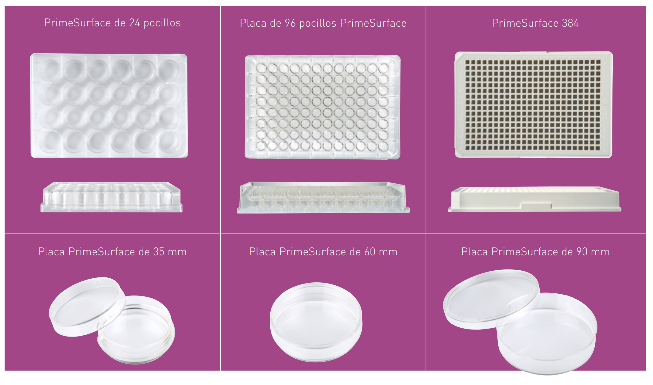 Los instrumentos de laboratorio PrimeSurface son placas y placas de cultivo celular con pocillos de adherencia ultrabaja (ULA) que promueven la formación de esferoides sin andamios y autoensamblada. Las placas están prerrecubiertas con un exclusivo polímero ultrahidrófilo que permite la formación espontánea de esferoides de tamaño y forma uniformes. Las placas ULA tienen una gran claridad óptica, por lo que son aptas para la adquisición de imágenes de campo claro y microscopia confocal. Además de las placas ampliamente utilizadas de 96 pocillos con fondo en U, también hay disponibles placas de 96 pocillos con fondos en V y en M, con lo cual los científicos pueden optar por formar esferoides más compactos, necesarios para tipos específicos de células. También hay disponibles placas de 384 pocillos de color transparente y blanco para las necesidades relacionadas con el cribado analítico de gran capacidad (HTS).