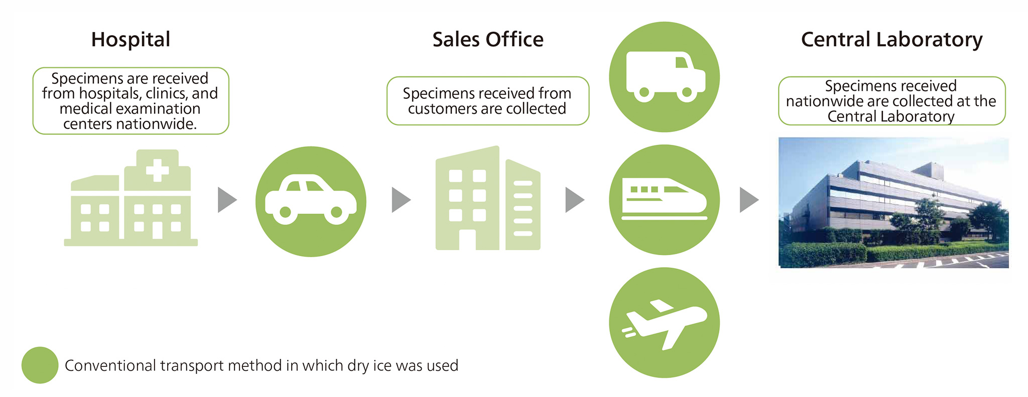 Previously, LSIM used dry ice to transport frozen specimens received from hospitals and clinics across Japan. The difficulty of reusing dry ice, accompanying CO2 emissions, unstable supply, and the risks of air transportation all presented challenges.