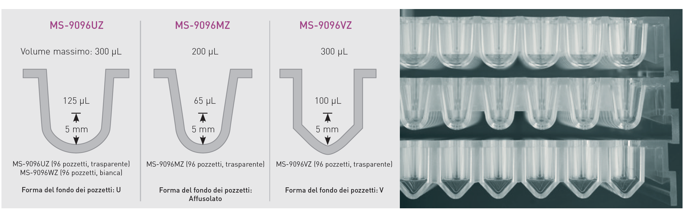 • Varietà di forme del fondo del pozzetto: fondo a U, fondo affusolato e fondo a V in formato a 96 pozzetti