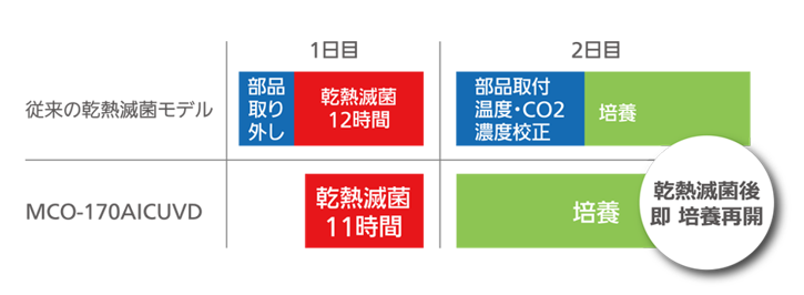 器内背面のダクトカバー後部に設置されたオゾンレスUV殺菌ランプが、循環する器内空気や加湿水の汚染物質を除染します。UVランプの紫外線はダクトカバーと加湿トレイカバーによって遮蔽されており、UV殺菌システムの稼働中も安全に細胞培養を継続できます。