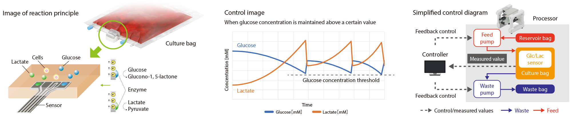 Cell state visualization through continuous changes in glucose and lactate concentrations Optimal culture conditions maintained through automatic culture control,contributing to enhanced cell quality
