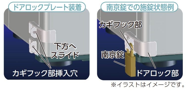 製品への取付けは、ネジ 2 本で簡単にでき、施錠もワンタッチです。(南京錠は、セットには含まれておりません)