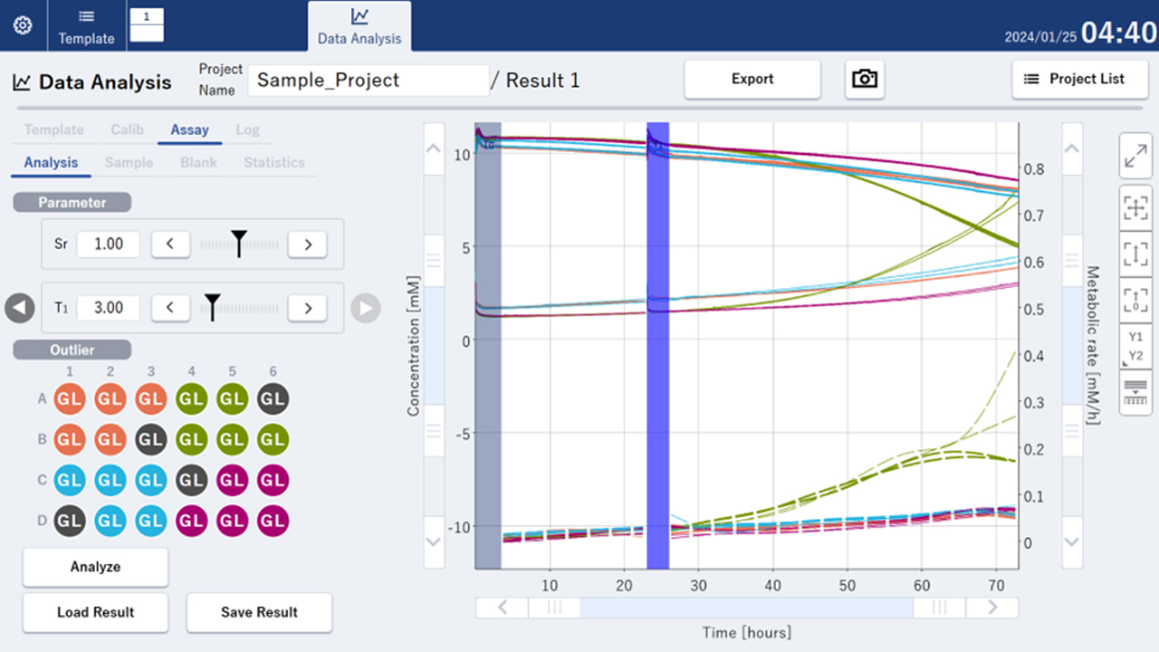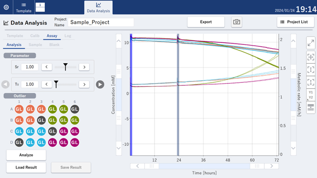 Analyzeボタンを押し、解析を行います。解析結果(濃度/代謝速度)がグラフエリアに表示されます。