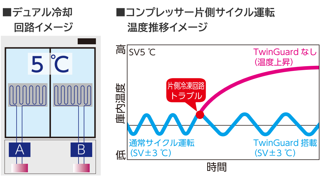 庫内温度センサー、デフセンサー、庫内用ファン、凝縮用ファン異常、LEDランプ点滅、温度表示部にエラーコードとエラーメッセージを表示、ブザー断続音による報知