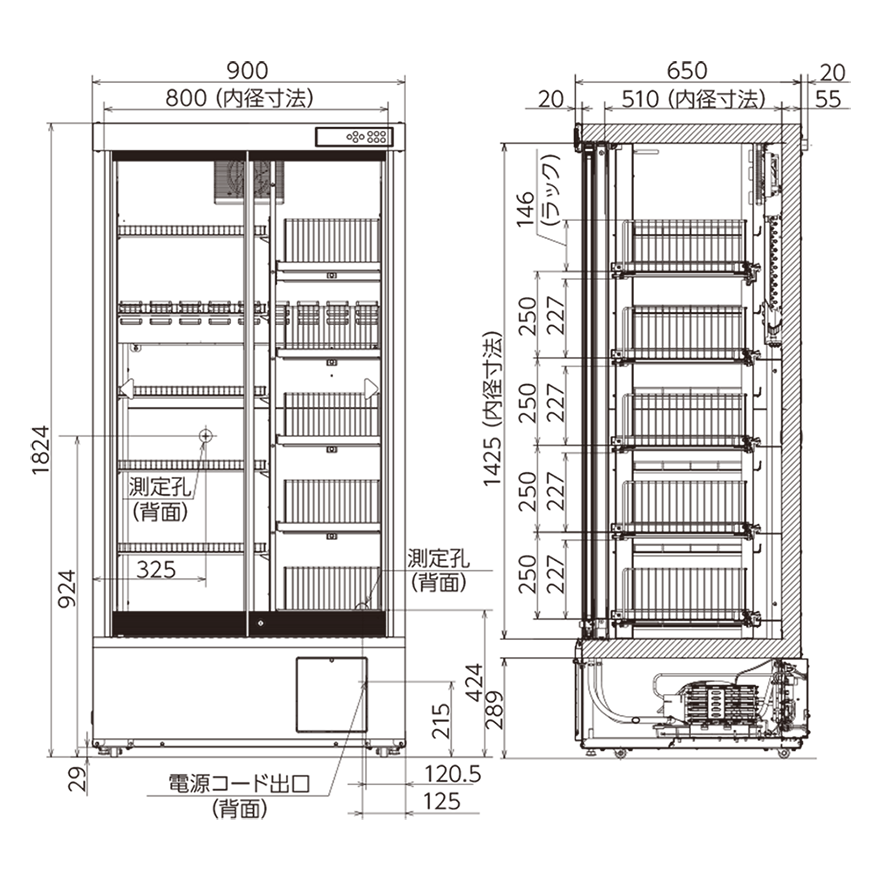 測定孔 2 ヵ所 庫内背面(Φ30 mm)