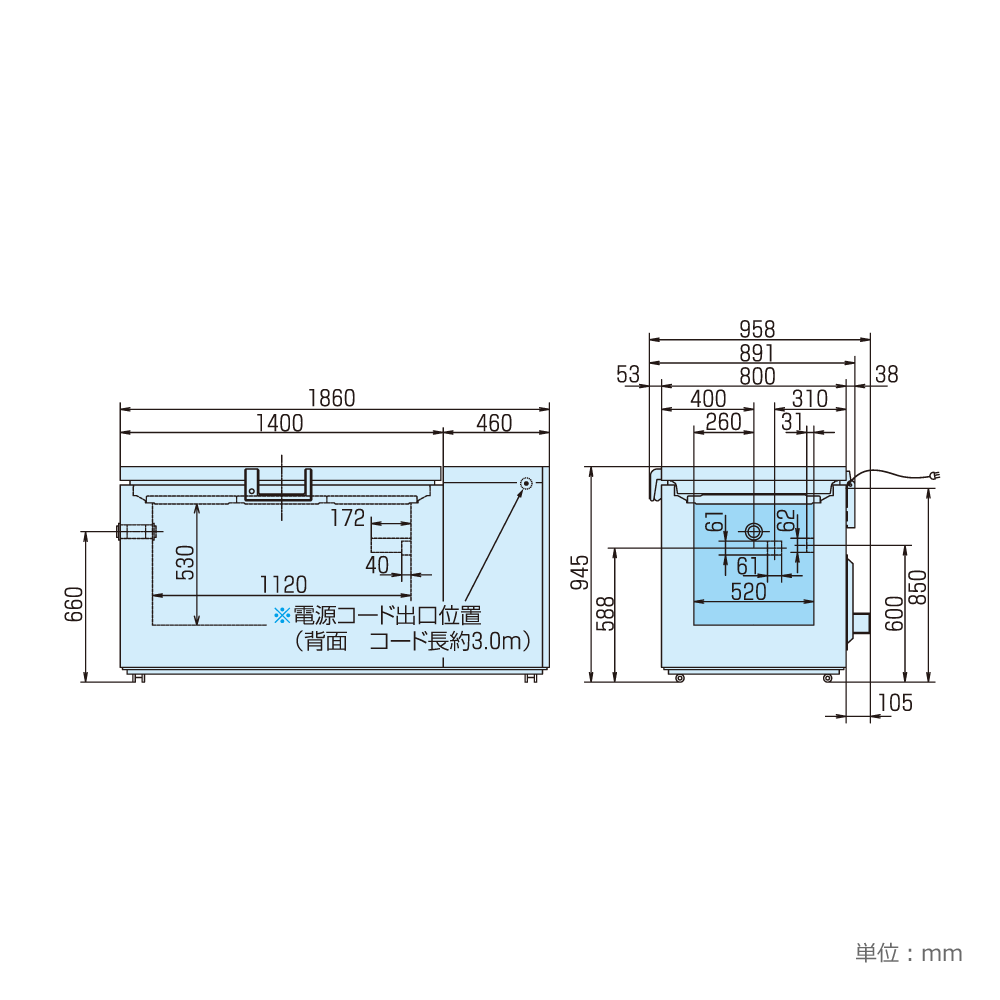 ※ 上記寸法は取手等の突起物を含みません。搬入時の必要寸法については寸法図をご参照ください。