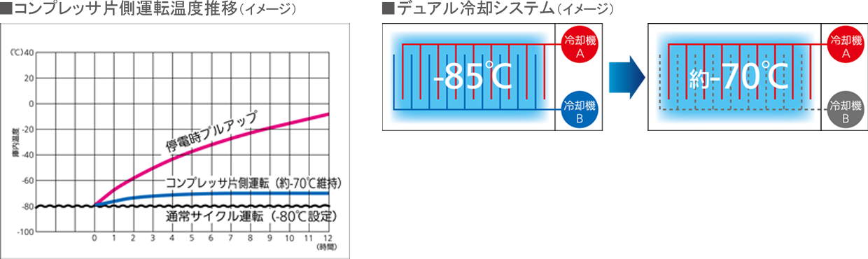 万が一片側冷凍回路にトラブルが発生しても、もう一方の冷凍回路で、約-70℃を維持します。