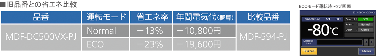 ※JIS C 9801(2006年度版)年消費電力量測定方法の温度条件での測定(-80℃設定、50Hz、無負荷)