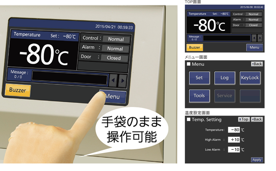 低温警報 設定温度-5 ℃ ~ -40 ℃(初期設定-10 ℃) 警報設定範囲外でAlarm表示文字点滅・庫内温度表示点滅・約15 分遅延後Warning表示・ブザー断続音・遠隔警報出力