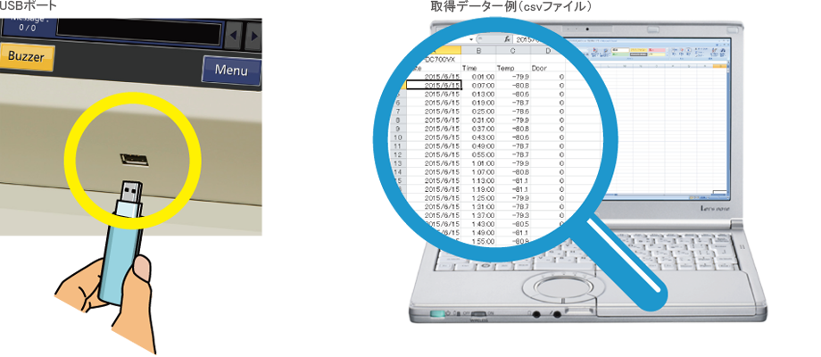 USBメモリーへログデータを移行し、PCで管理可能です。