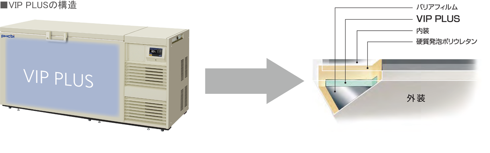 硬質発泡ポリウレタンフォームの6倍の断熱性能を持つVIP PLUSを前面に採用。