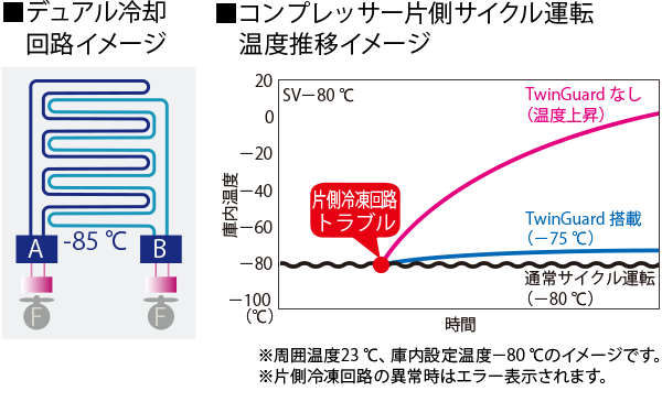 -85 ℃ / 片側運転時-75 ℃(周囲温度:30 ℃ 無負荷)