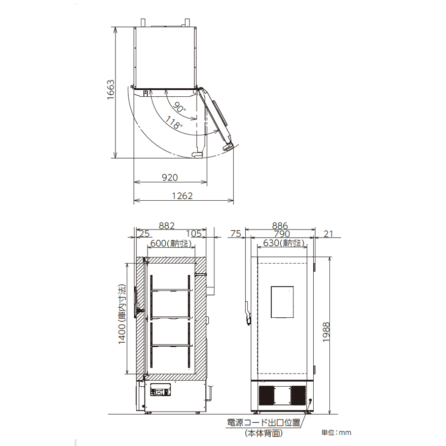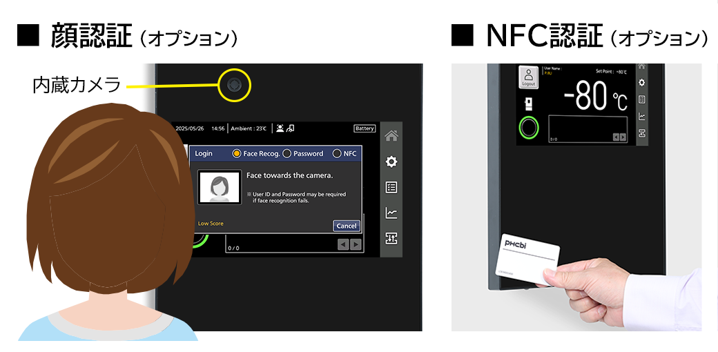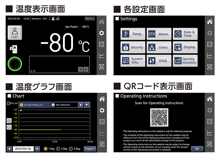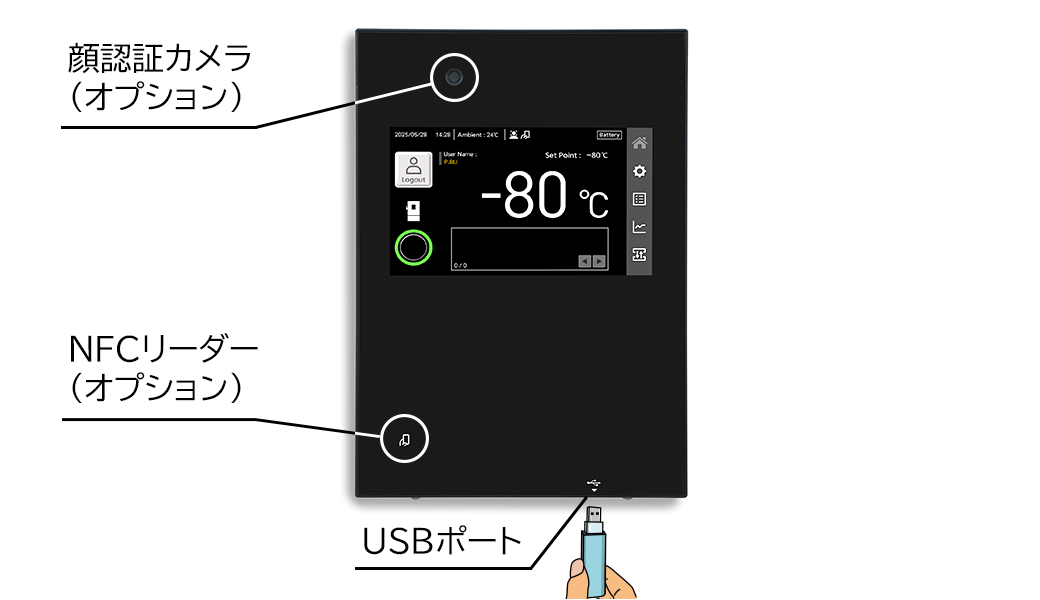 設定温度-40 ℃~-5 ℃(初期設定-10 ℃) ステータスインジケータ―橙点滅 庫内温度表示点滅、二次元バーコード表示 約15 分遅延後、ステータスインジケータ―赤点滅、ブザー断続音、遠隔警報出力、二次元バーコード表示