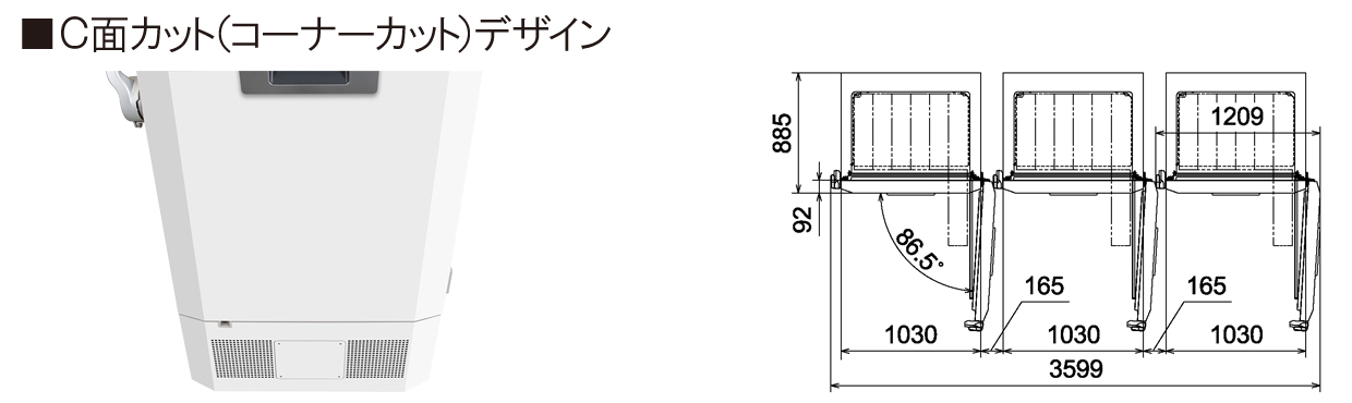 C面カット(コーナーカット)デザインにより複数台設置時のドア開閉スペースを削減。