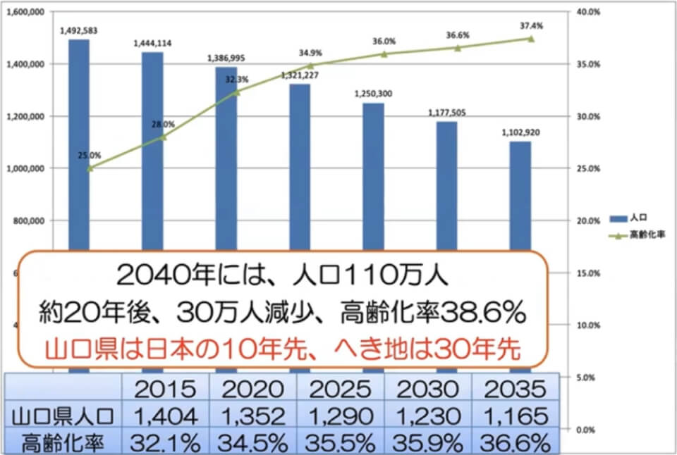 山口県は、県土全体のうち約60%が「へき地」と呼ばれる医療提供の困難な地域を有しています。また、医療の提供が難しいとされる有人離島が本州最多となる21島も存在します。山口県民の約14%(約20万人)がへき地に暮らしており、住民の高齢化が進んでいます。こうした地域における医療体制の確保は重要なテーマであり、保健・医療・福祉の確保も課題となっています。