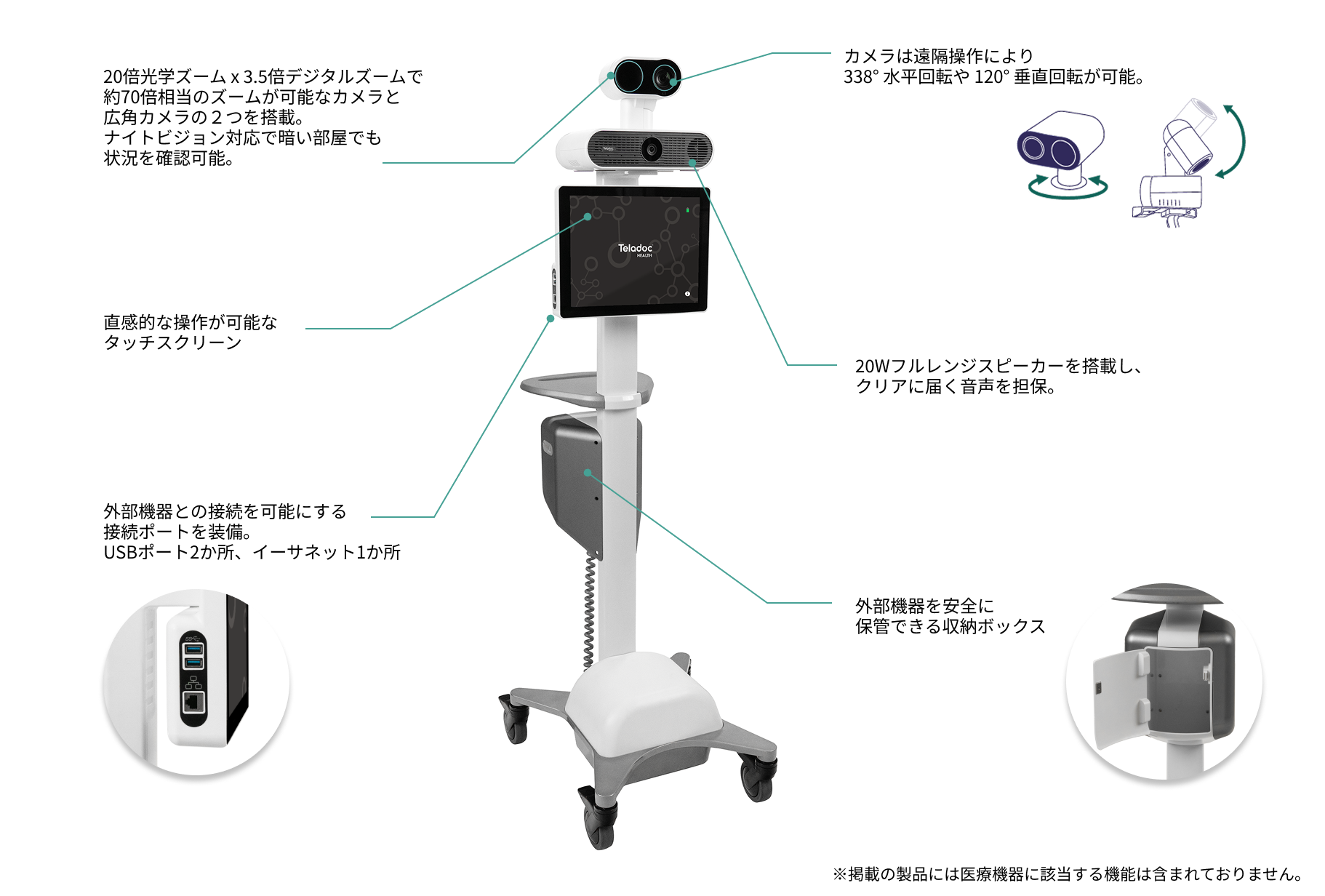 バッテリーを搭載しているため、コンセントがない場所でも一定時間利用可能です。カートを移動することで、病室や手術室など、必要な場所で医師と接続できます。