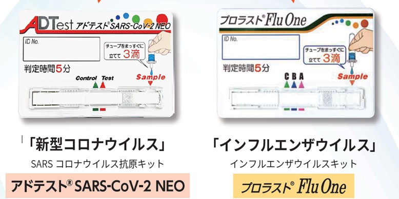 SARSコロナウイルス抗原キットアドテストSARS-CoV-2 NEO アドテスト SARS-CoV-2 NEOとプロラスト® Flu Oneの検体共用 アドテスト SARS-CoV-2 NEOとプロラスト® Flu Oneの使用可能検体 添付文書掲載データ 製品名 鼻咽頭ぬぐい液 鼻腔ぬぐい液 プロラスト® Flu One ○ ○ プロラスト® SARS-CoV-2 Ag ○ ○ 判定時間は5分 新型コロナウイルス(SARS-CoV-2)の抗原を、イムノクロマト法を用いて迅速(5分間)、簡便に検出します。 概要 製造販売元:アドテック株式会社 発売元:株式会社LSIメディエンス 商品コード:225208 テストカード(10枚) 検体抽出液(10本) フィルター付きノズル(10個) 滅菌綿棒(鼻腔用) 簡易スタンド(1つ) 製品名 アドテストSARS-CoV-2 NEO 包装 10テスト 貯法 1~30℃ 反応時間 5分 採取方法 【鼻咽頭ぬぐい液の採取方法】 滅菌綿棒を鼻腔孔から耳孔を結ぶ線にほぼ平行に鼻腔底に沿ってゆっくり挿入し、鼻咽頭を数回擦過して、ぬぐい液を採取します。 【鼻腔ぬぐい液の採取方法】 滅菌綿棒を鼻腔に沿って2cm程度挿入し、鼻甲介付近をゆっくり5回程度回転させ、ぬぐい液を採取します。 *被検者自身が採取する際は、鼻出血が起こりやすい部位である点にも配慮し、医療従事者の管理下で実施してください。 検体の抽出・測定操作方法 綿棒を検体抽出液に浸した状態で、検体抽出部でゆっくり上下させながら5~10回程度回転させてください。 ゆっくりと綿棒を引き抜き付属のフィルター付きノズルをしっかりとはめ込んでください。 チューブをまっすぐ立てて検体滴下部(Sample▼)とノズルの間を約1cm空けて3滴をゆっくり滴下します。 判定方法