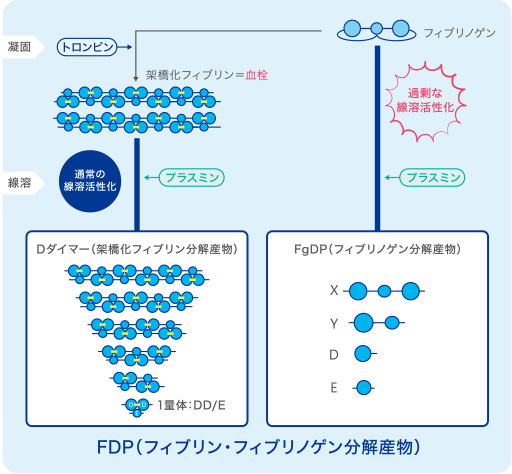 一方、過剰に線溶が活性化されるとフィブリノゲン分解産物(FgDP)が生成され、Dダイマーとあわせてフィブリン・フィブリノゲン分解産物(FDP: Fibrin/fibrinogen degradation products)と呼ばれています。FDPは線溶活性化の評価で用いられており、各種のDIC診断基準に採用されています。