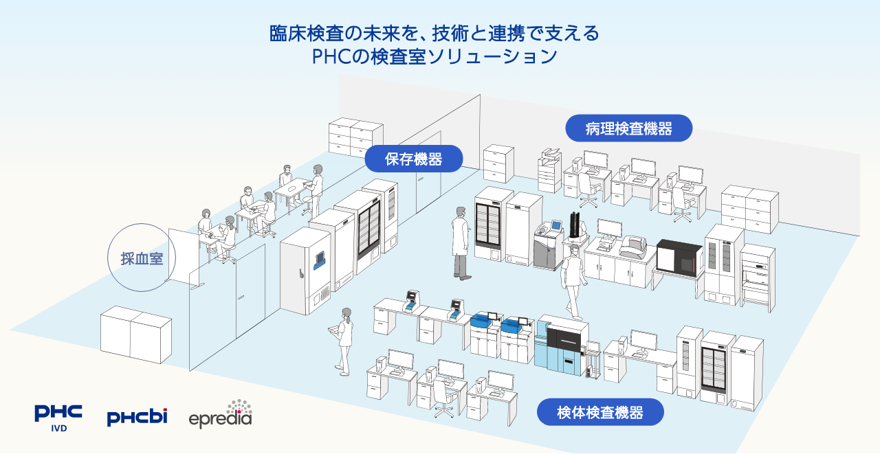 PHCは、検体検査機器・試薬、病理検査機器、保存機器を組み合わせ、検査室全体を包括的にサポートします。検査の業務フローに沿った機器配置と連携により、業務効率化・情報連携・高精度を実現し、検査技師が本来の専門性を発揮できる環境を提供します。