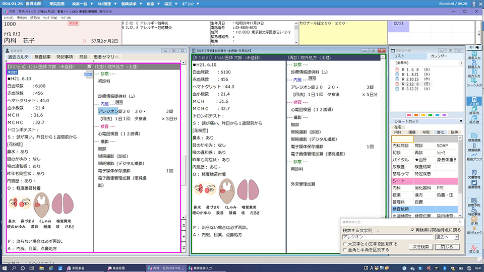 カルテ画面からワンクリックで検索ウィンドウが表示できます。