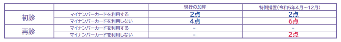 前述の施設基準を満たす保険医療機関において、初診を行った場合における評価の特例として、医療情報・システム基盤整備体制充実加算(マイナンバーカードの利用がない場合)が4点から6点に変更されます。