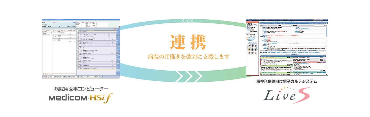 病院用医事コンピューター「Medicom-HSif」と、精神科に特化した電子カルテシステム「Live(ライブ)」とのスムーズな連携が医療スタッフ同士一体となった効率の良いチーム医療体制を実現します。