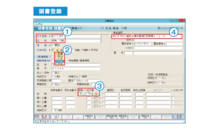 初診時の頭書登録では、住所データベース、保険者データベースも