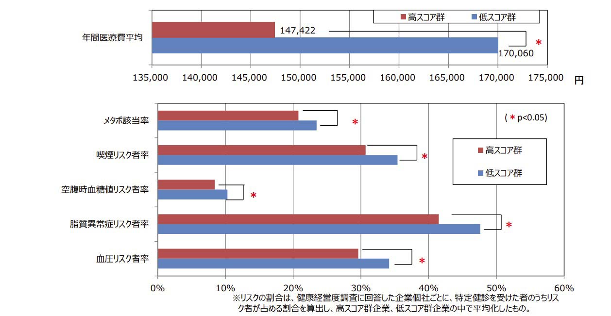 さらに、2016年に東京大学等が土木建築業の大企業23社を対象に健康経営の取り組みと健康診断データを分析した結果、高スコア群企業は低スコア群企業と比較して、以下の6項目でいずれも低い数値を示しました。