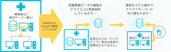 現在提供されているMedicom Cloud運用継続サービスは、医事一体型電子カルテシステムのデータを逐次クラウド上に保存しています。院内のデータが使用できなくなった際にはデータ復旧の環境構築や作業の必要もなく、クライアント証明書をインストールしたパソコンとID/パスワードさえあれば、即座に平常時とほぼ同じ環境で電子カルテ運用ができます。Medicom Cloud運用継続サービスの活用は、災害時の診療データ保護に加え、診療継続を可能にするものです。