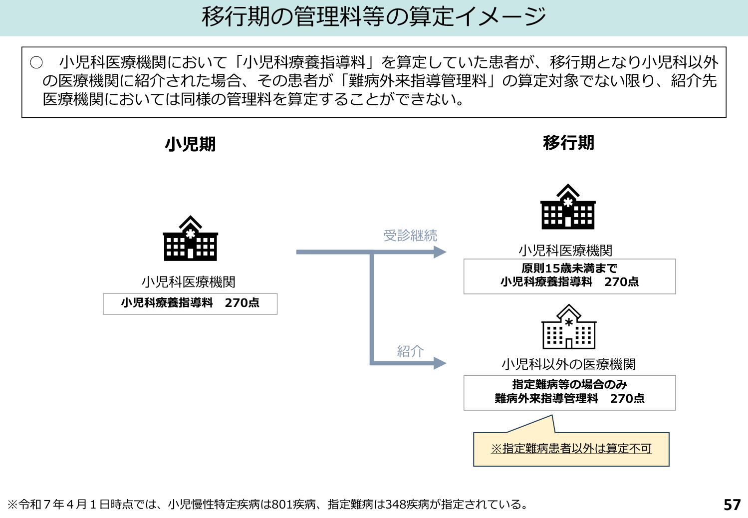 ◆令和5年の出生数は調査開始以来最少の72万7千人でした。出生数の減少は産科・小児科の医療提供体制に大きな影響を与えています。令和8年度改定に向けた論点のひとつとして、小児から成人への移行期医療については、小児科療養指導料を算定していた患者が成人し、一般診療科に移行した場合において、小児慢性特定疾病が指定難病に含まれていないケースでは、移行先で同様の管理料を算定できないという課題があるため、今後は小児科から移行した患者について、一定期間は紹介先でも同様の管理料を算定できるような方向で検討されました。