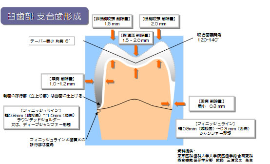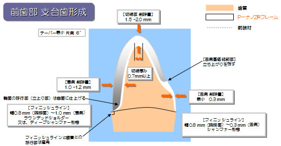 従来のオールセラミック修復では、一般的に支台歯を1.0mm~2.0mm削除する必要がありました。本製品は、0.3mm厚の薄いフレームを実現する事で、支台歯の削除量を抑える事が可能です。特に舌側は、最小0.3mmの削減量で支台歯形成を行うことができるため、患者への負担が少ない低侵襲オールセラミック修復が可能です。
