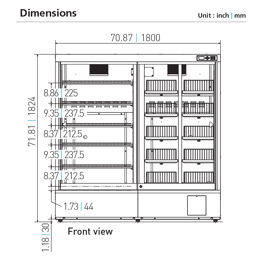 EXTERNAL DIMENSIONS 70.9" W x 25.6" D x 71.8" H (1800 x 650 x 1824 mm)