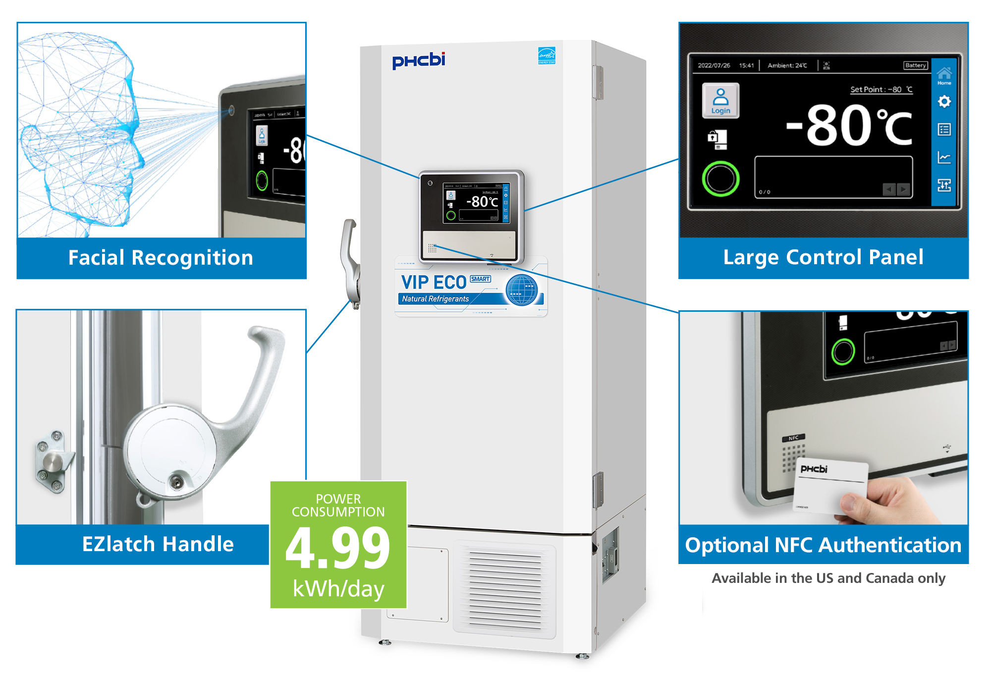The PHCbi brand VIP ECO SMART features integrated systems to secure your highly valued inventory. SMART features include three lock methods: facial recognition, keypad, or optional proximity card. Controlled freezer access monitors who has entered the ULT freezer and when and tracks total door opening duration.